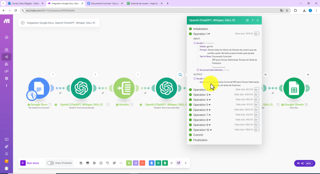 El siguiente paso es crucial: transformar este contenido con OpenAI. Usando el modelo GPT avanzado, el contenido se procesa para extraer títulos principales y convertirlos en posibles historias de usuario. Este módulo, llamado “Transform Text to Structure Data”, marcadamente acelera el paso de análisis textual, identificando de manera eficiente los elementos necesarios para construir una historia de usuario completa.