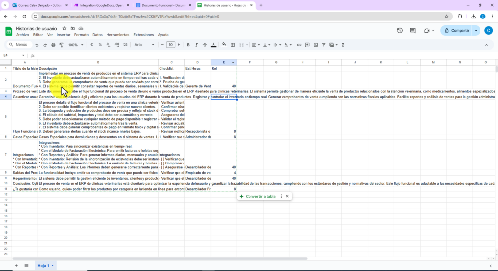 Una vez clasificados los títulos, llega el momento de crear cada historia de usuario de forma individual. Esto puede sonar laborioso, pero gracias a la automatización, el proceso se simplifica. Usando de nuevo la herramienta de transformación de texto, puedes definir aspectos críticos de cada historia de usuario, como la descripción, los criterios de aceptación, un checklist para verificación, roles asignados e incluso una estimación de horas necesarias.